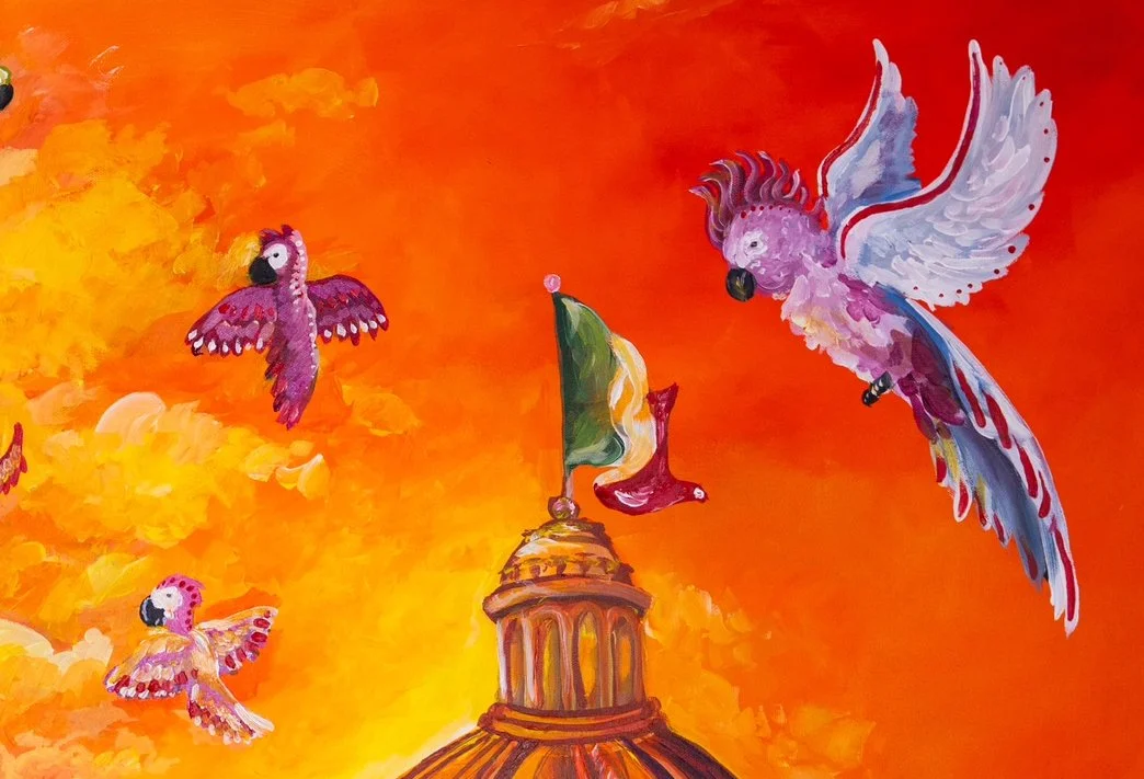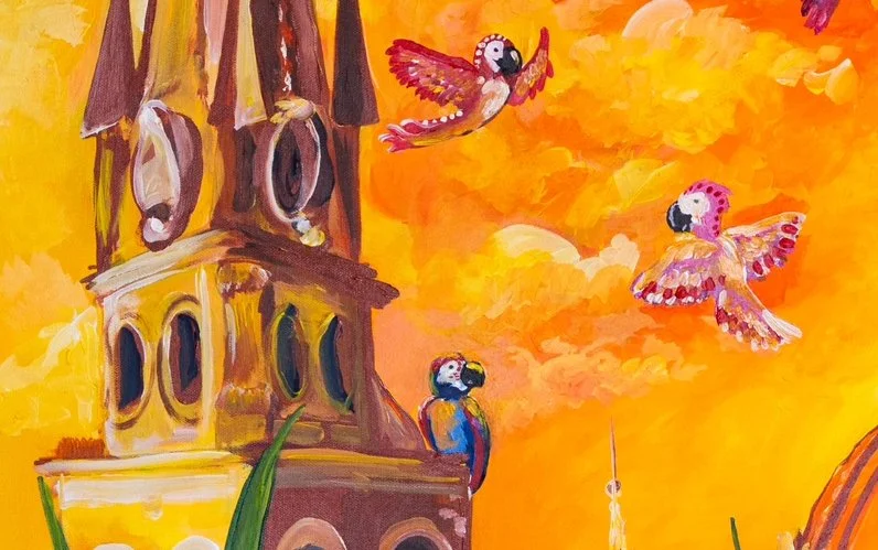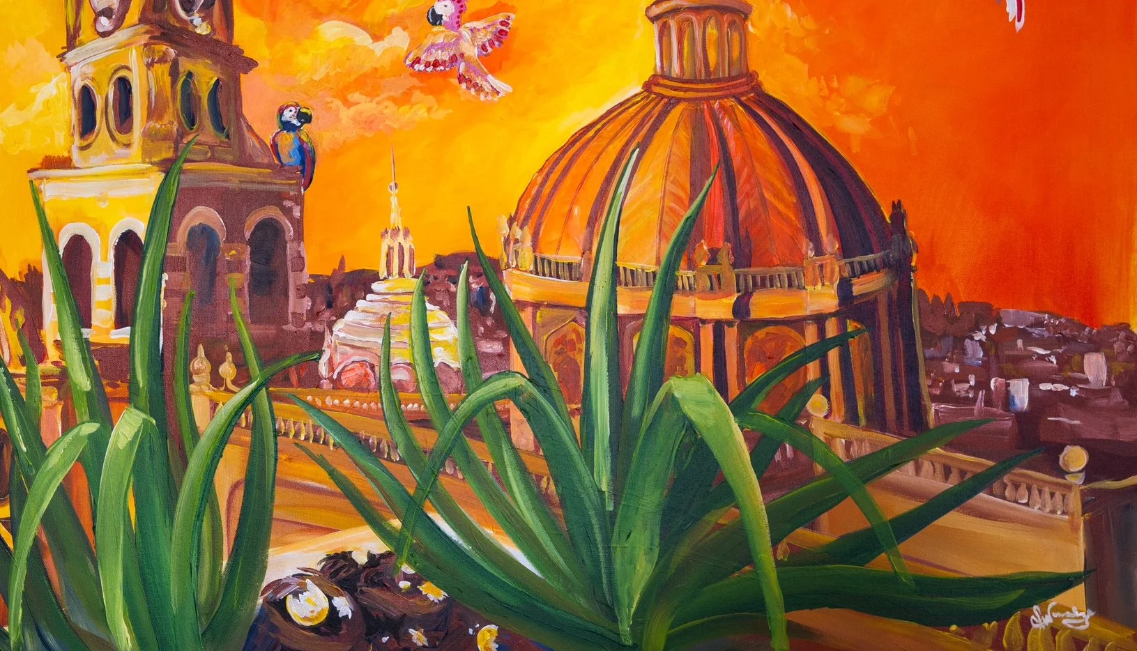 This 38”x48” painting, titled “Buenos Días, Guadalajara,” pays homage to the roots of Fiesta Hill’s owner, Manuel Gomez Morones. Representing his family’s home in Guadalajara, Manuel is depicted as the blue macaw perched atop the iconic Cathedral of the Assumption of Our Lady. The two larger birds symbolize his parents, whose love and guidance have shaped their family’s journey. The four smaller birds represent his two brothers and two sisters, each finding their place in this colorful celebration of heritage and family unity.