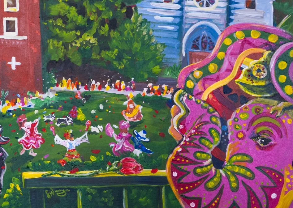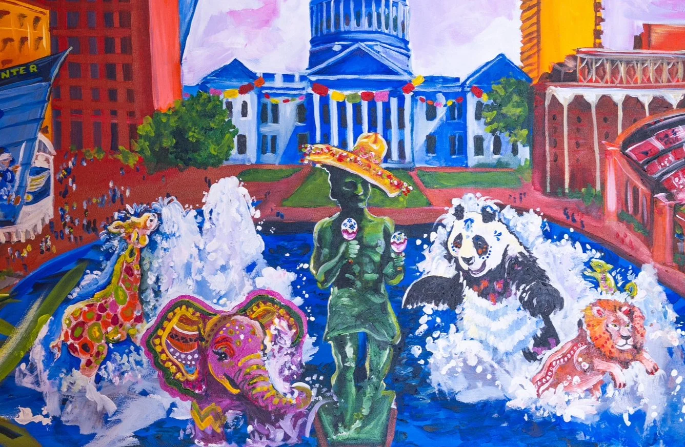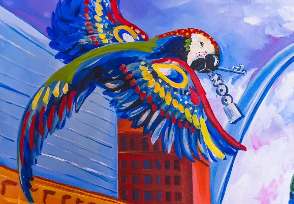 "Buenas Tardes, San Luis Misuri" captures the next chapter of the journey, set against the iconic backdrop of the Gateway Arch and the Missouri State Capitol. Our Blue Macaw, shows his move to St. Louis, where he began his own family. His two children are represented by a colorful elephant and giraffe, while his nieces and nephews come to life as a panda and a lion. The painting tells a whimsical story of the macaw unlocking these animals from the St. Louis Zoo. They run loose through St. Louis landmarks like Busch Stadium and Enterprise Center add a touch of local pride to this vibrant narrative of new beginnings and familial bonds.