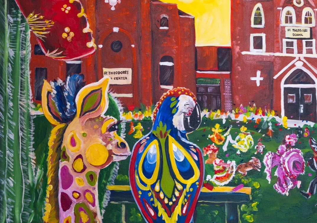 His children, depicted as an elephant and giraffe, stand beside him, reflecting the continuation of his family’s legacy. A chameleon, representing the artist, looks out towards St. Theodore School and Church, blending her personal history and connection with this family.